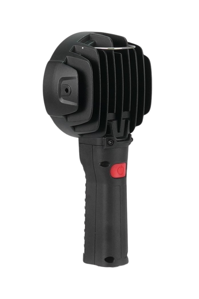 Der ergonomisch geformte Handgriff mit integriertem Ein-/Aus-Schalter ermöglicht eine sichere und komfortable Bedienung auch mit Handschuhen. Zusätzlich verfügt der Suchscheinwerfer über einen klappbaren Bügel, mit dem sich die Leuchte aufhängen oder positionieren lässt. Das ist besonders praktisch bei stationären Ausleuchtungen oder im Einsatzfall, wenn beide Hände frei bleiben sollen.